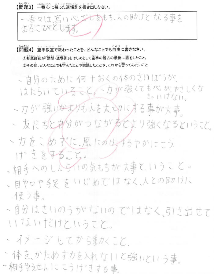 【問題4】空手道場で教わったことや実践していることを、どんなことでも書きなさい。