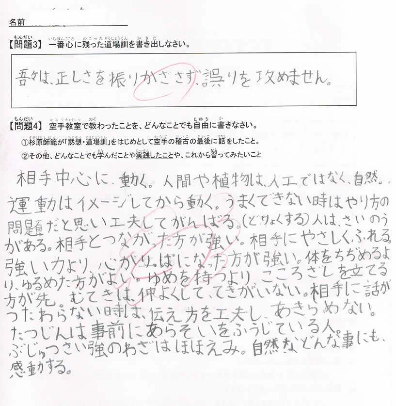 【問題4】 道場で教わったことを、どんなことでも自由に書きなさい。